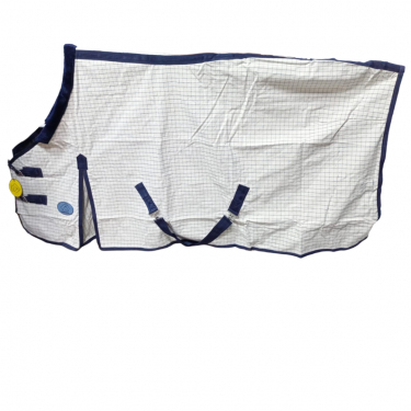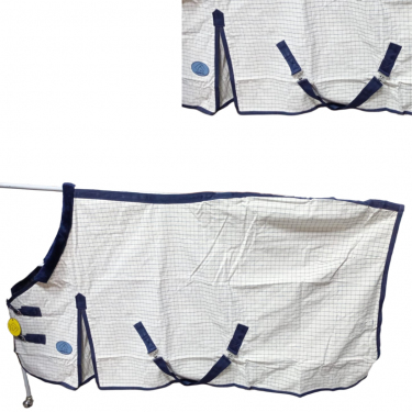 Попона из 100% плотного хлопка с перекрещивающимися подпузными ремнями, подножными ремешками на карабинах, шаговой выточкой. Без нахвостника. Отделана мягким флисовым воротником. Две простые застежки на груди на пряжках.