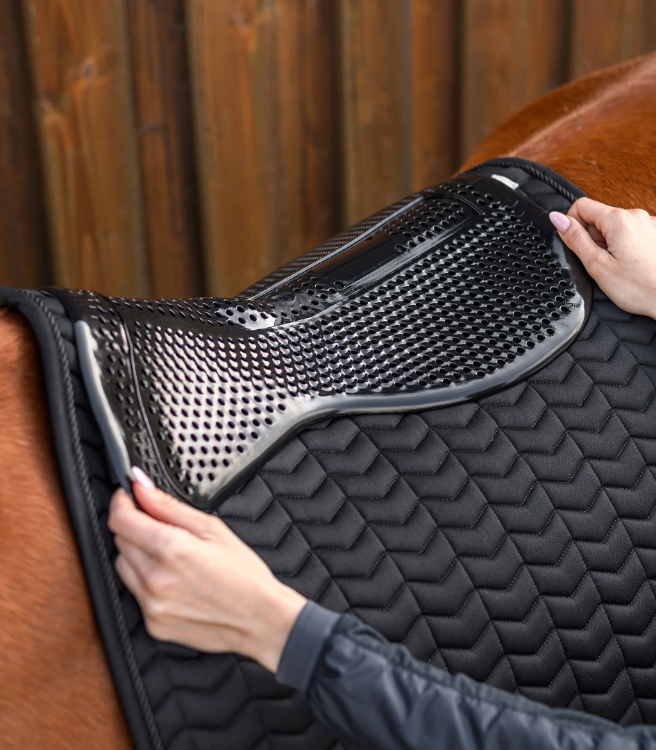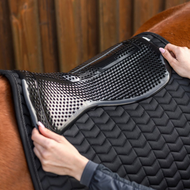 Амортизатор гелевый под седло, эластичный и гипоаллергенный. Гель разработан для снижения давления на спину, куда приходится не малая часть веса всадника. Липкая структура геля обеспечивает прилипание к седлу и минимизирует дискомфорт от движений всадника, сбоку, сзади и спереди. Такой гель подходит для всех лошадей, с ним седло отлично ложится на спину. Если необходимо приподнять переднюю или заднюю часть седла, уменьшив давления на эти области можно приобрести дополнительные подушки для этих областей. Гель легок в уходе, не токсичен, его можно стирать в машине (30 С), или просто сполоснуть под струей воды, используя мыло. Можно обрезать под любой размер и форму. Удерживает седло на месте, не даёт ему соскальзывать. Мягкий и удобный, размер: 51 х 34 см.