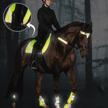 Вальтрап светоотражающий под универсальное седло. Неоново-желтый внешний материал вальтрапа обеспечивает дополнительную безопасность лошади и всадника! Вальтрап дополнен светоотражающей окантовкой и двумя светоотражающими полосками с обеих сторон. Петли для крепления с сенсорной лентой. Используйте в темное время суток и в тумане для улучшения видимости в темное время суток всадника и лошади! Материал: 80% полиэстер, 20% хлопок Подкладка: 100% полиэстер
