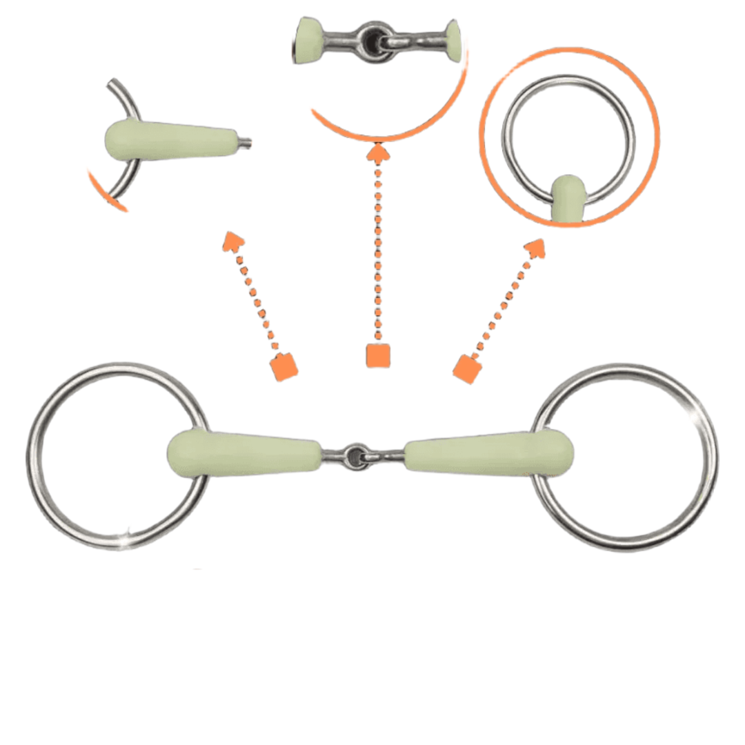 Трензель пластиковый для лошади с простым сочленением. Толщина грызла 19 мм, диаметр колец 65 мм. Вкус яблока.