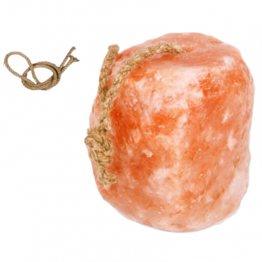 Кусок гималайской соли на верёвке. Розовая соль содержит медь, калий, магний, кальций, железо и много других минералов. Благодаря железу соль имеет розовый цвет. Она помогает выводить токсины из организма, сбалансировать уровень PH, уравновешивает нервную систему, расслабляет мышечную систему, улучшает циркуляцию крови. Содержит микроэлементы в натуральном, природном виде. Микрочастицы гималайской соли легко усваиваются организмом и питают его на клеточном уровне. Она имеет 100%-ную биологическую усвояемость организмом по причине того, что она не подвергается преобразованиям в процессе обмена веществ и сразу попадает в клетки в первоначальном виде. Регулярное использование розовой соли обеспечивает организм всеми необходимыми минералами и микроэлементами. Этот продукт балансирует электролиты и уровень pH, и помимо прочего, помогает избавится от артрита.